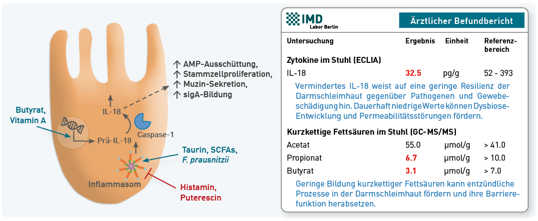 Interleukin-18 (IL-18) wird im Gegensatz zu anderen Interleukinen konstitutiv von Darmepithelzellen ausgeschüttet. Es fördert die Epithelregeneration und die Produktion von Muzin, sekretorischem IgA und antimikrobiellen Peptiden. Auf diese Weise reguliert IL-18 die Zusammensetzung der Mikrobiota und die Darmbarrierefunktion mit. Niedrige Werte im Stuhl weisen auf verminderte Resilienz der Darmschleimhaut, Dysbiose und Permeabilitätsstörungen hin – nicht selten im Zusammenhang mit einem Mangel an kurzkettigen Fettsäuren (insbesondere Butyrat). Erhöhtes Il-18 spricht dagegen für ein proinflammatorisches Geschehen. IL-18 im Stuhl eignet sich damit als Marker zur differenzierten Beurteilung der Schleimhautfunktion und der entzündlichen Aktivität im Darm. Weiterführende Details finden Sie in unserer Diagnostik-Information.