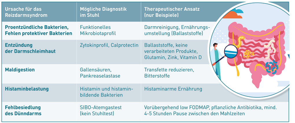 Insbesondere beim Diarrhoe-dominiertem Reizdarmsyndrom gibt es Hinweise auf Veränderungen der Darmmikrobiota, die eine Erhöhung von proinflammatorischen Proteobacteria und eine verminderte Menge von probiotischen Bakterien wie Bifidobacteria und Lactobacillus einschließen. Proteobacteria tragen toxisches Lipopolysaccharid (LPS) auf ihrer Oberfläche, das die Schleimhaut reizt. Das Fehlen schleimhautschützender Bakterien macht die Darmschleimhaut gleichzeitig weniger resilient gegenüber Toxinen und Pathogenen. Die Folge kann eine lokale Entzündung sein. Auch eine Dünndarmfehlbesiedlung (SIBO) kann Reizdarmbeschwerden verursachen. Bei 30 - 70 % der Reizdarmpatienten lässt sich eine SIBO nachweisen. Verdauungsstörungen (Maldigestion) oder eine hohe Histaminbelastung im Darm kommen ebenfalls als Ursache infrage.