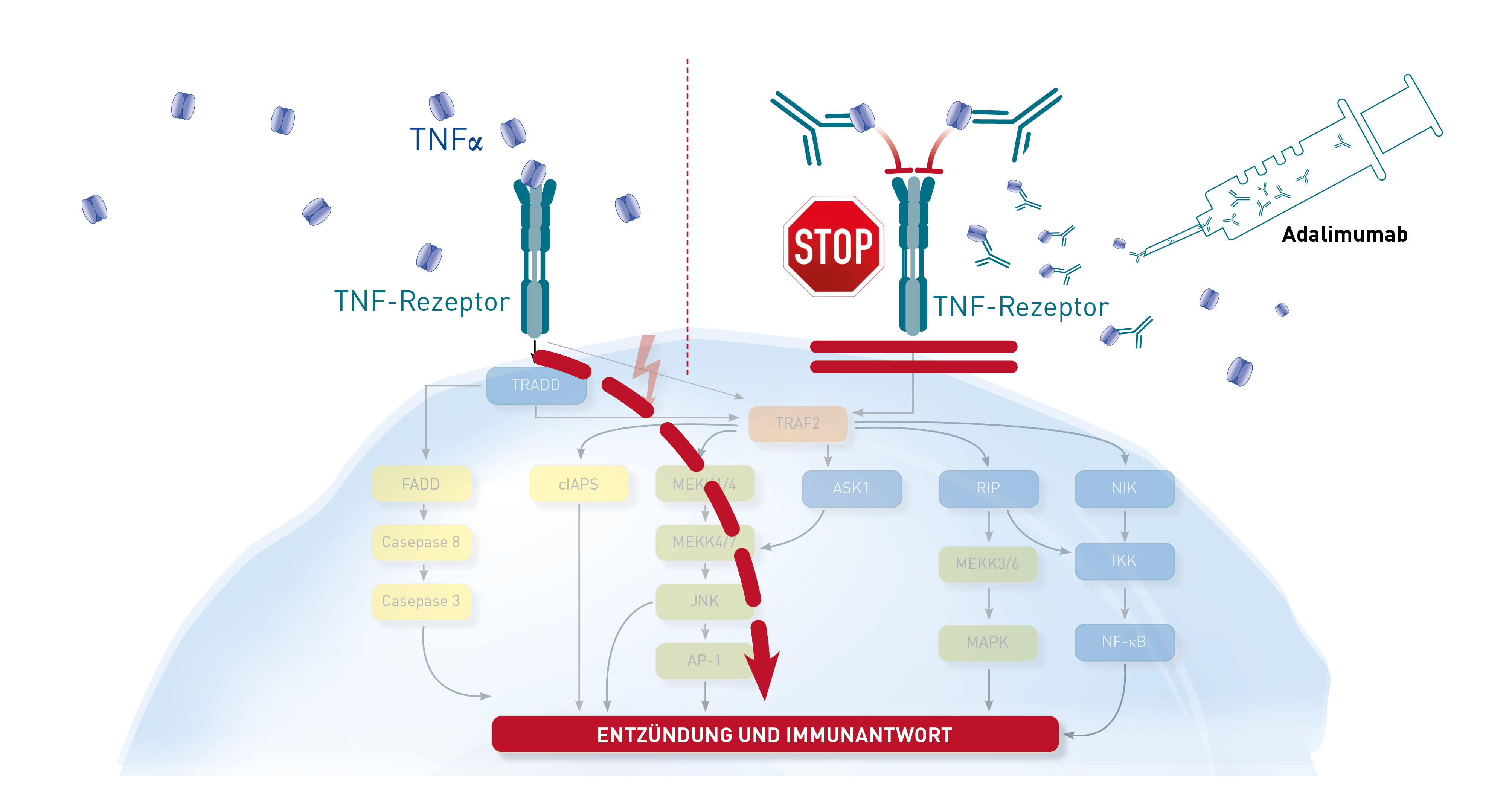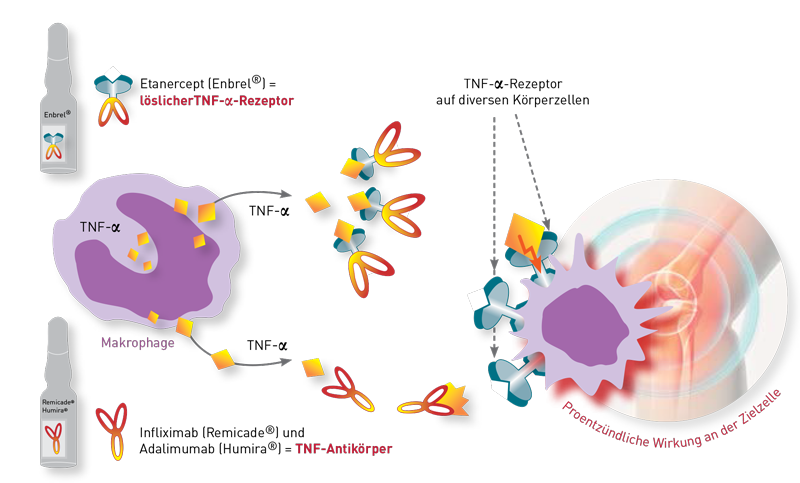 Ein anderes Wirkungsprinzip verfolgen die monoklonalen TNF-Antikörper Adalimumab (z. B. Humira®) und Infliximab (z. B. Remicade®). Diese Antikörper binden ebenfalls an TNF-α, allerdings nicht wie ein Schlüssel, der genau auf das Schloss passt, sondern als ein Anhängsel am TNF-Molekül. Durch die Bindung des Antikörpers an TNF-α verändert sich die Form des Zytokins mit der Folge, dass es nicht mehr in den zellständigen Rezeptor am Zielorgan passt. Der Effekt ist letztlich der gleiche. Die Auslösung oder Verstärkung der entzündlichen Reaktion durch TNF-α an den Organen wird gehemmt.