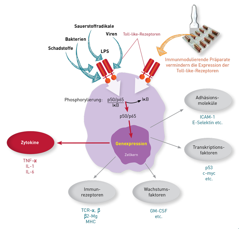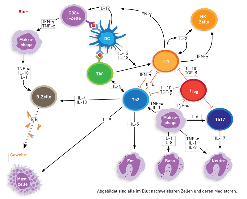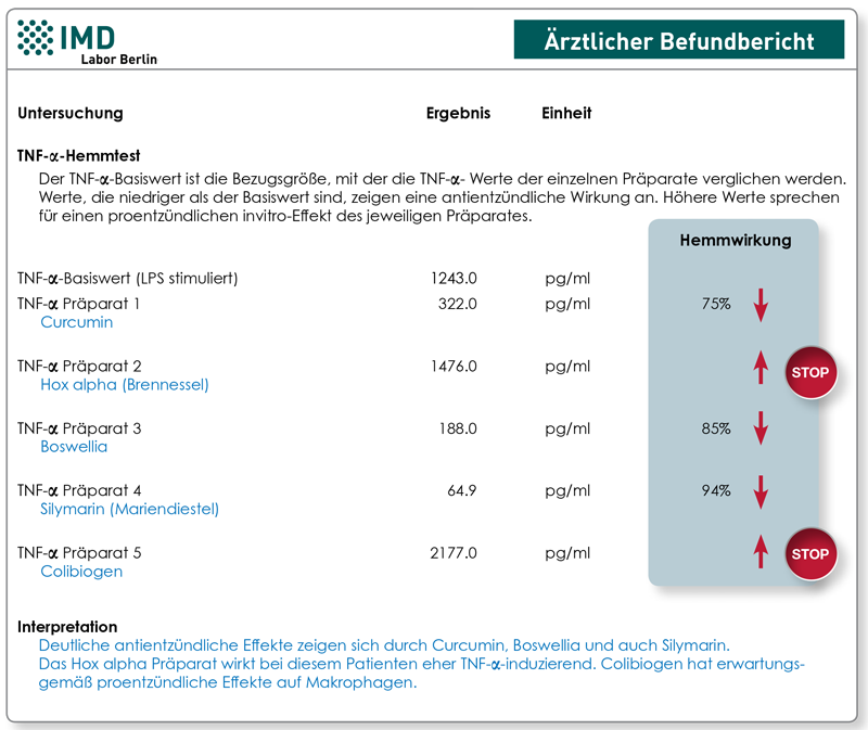 Daher lässt sich anhand des modulierten TNF-α-Spiegels unmittelbar auf die NFκB-Aktivierung der Monozyten schließen. Auch der Hemmtest für das TH2-Zytokin IL-4 ist aussagefähig, weil TH2-Lymphozyten im Blut permanent rezirkulieren.