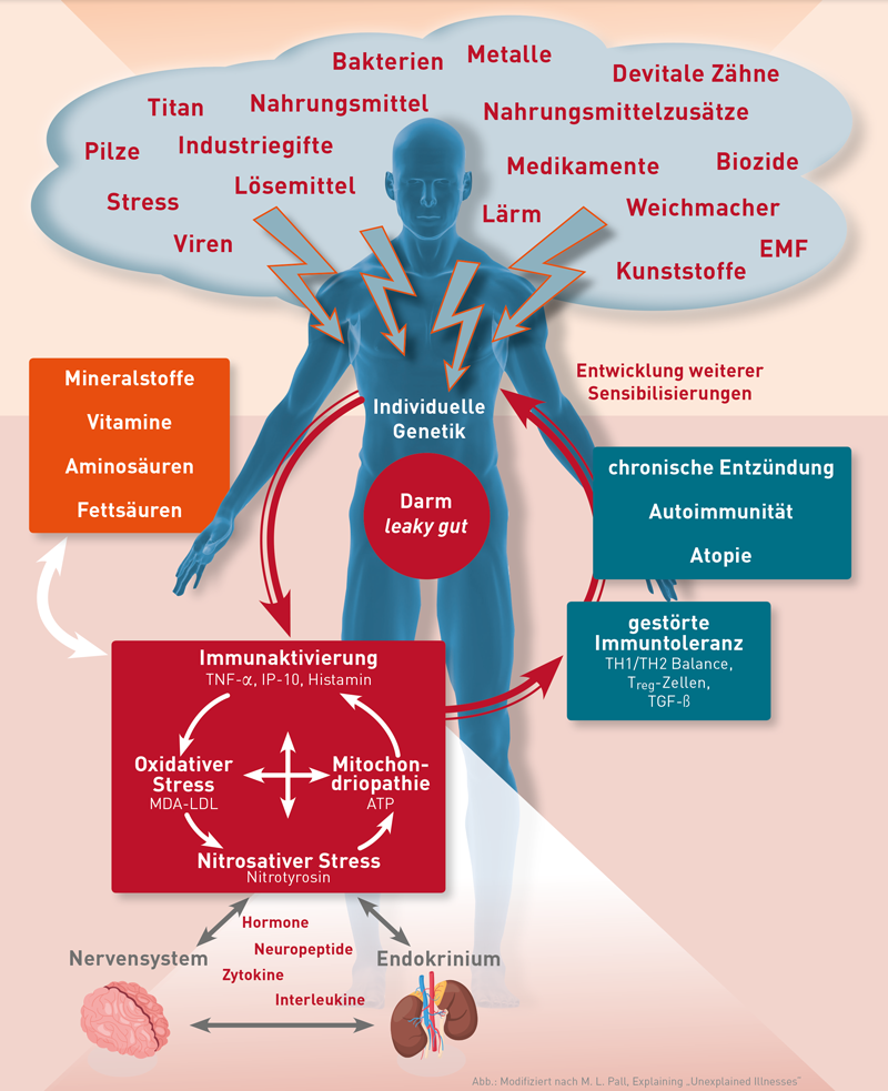 Die Abbildung zeigt die Vielfalt möglicher relevanter Auslöser einer chronischen Entzündung und soll symbolisieren, dass bei einem Patienten oft mehrere gleichzeitig einwirkende Triggerfaktoren von Bedeutung sind. In Abhängigkeit von der vorliegenden Exposition (Belastung) und den individuellen Reizschwellen (individuelle Sensibilisierung und genetische Prädispositionen?) stören die auf den Organismus einwirkenden Triggerfaktoren die Regulationstetrade aus Immunaktivierung, oxidativem und nitrosativem Stress sowie der Mitochondrienfunktion. Diese Regulationstetrade ist das Brückenglied zwischen den endogenen und exogenen Umweltfaktoren und der bei chronischen Entzündungserkrankungen gestörten Immuntoleranz.