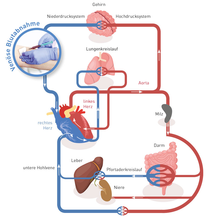 Endotoxine (Synonym: Lipopolysaccharide LPS) sind Bestandteile der Zellwand gramnegativer Bakterien. Es ist richtig, dass bei gestörter Darmpermeabilität von den Darmbakterien herrührende Endotoxine vermehrt über die Darmwand aufgenommen werden. Der Darm wird aber bekanntlich durch die Venen des Pfortadersystems drainiert. Das Pfortaderblut passiert initial die Leber, wo je nach Leberfunktion zwischen 95 und 99 % des Endotoxins schon bei der ersten Passage eliminiert werden („first pass effect“). Bis zur Blutabnahme aus der Armvene passiert das Blut noch die rechte Herzkammer, die Lunge, die linke Herzkammer und dann auch noch das gesamte arterielle Kapillarbett der Körperperipherie. Deshalb lässt der peripher-venöse Endotoxinspiegel keinen Rückschluss auf die Translokation im Darm zu. Um tatsächlich auf das im Darm translozierte Endotoxin rückzuschließen, müsste man das Blut aus der Pfortader entnehmen, was nicht möglich ist. Die Blutabnahme aus der Armvene kommt sprichwörtlich zu spät (siehe Abbildung). Ebenfalls ungeeignet zur Feststellung einer systemischen Endotoxinbelastung ist die Bestimmung der LPS-Antikörper. Die Bildung der Antikörper gegen die Endotoxinmoleküle ist variabel und wird mehr durch individuelle Antikörperbildung und -abbau beeinflusst, als durch die Menge an aufgenommenem oder zirkulierendem Endotoxin.