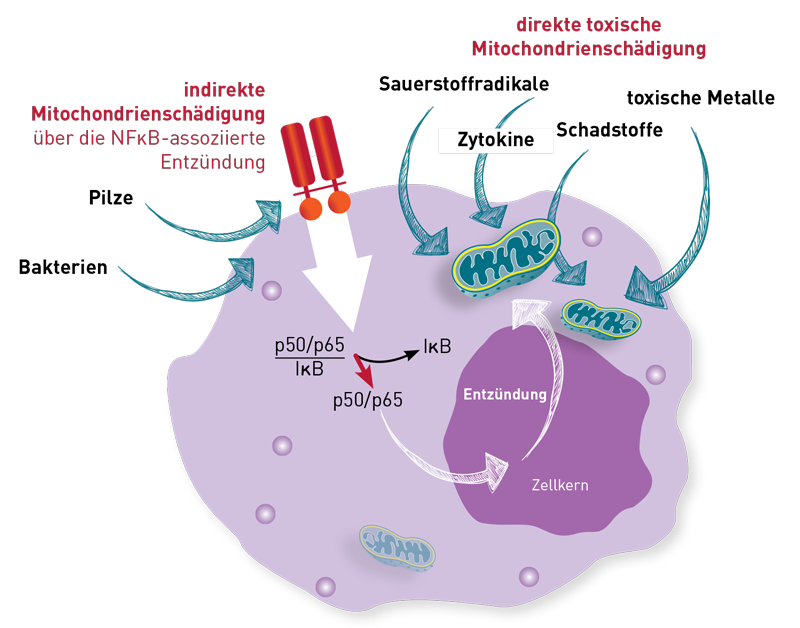 Wie die Abbildung zeigt, wäre hier auch nicht zu unterscheiden, ob das Agens direkt auf die Mitochondrien wirkt oder über die Aktivierung von NFκB. Zusätzlich stellt sich die Frage, womit eine „Belastung“ im Labortest adäquat imitiert werden kann. Der zelluläre Stress einer chronischen Entzündung oder einer multiplen Schadstoffbelastung ist sehr komplex und lässt sich nicht durch einzelne Komponenten wie z. B. das häufig genutzte Thiomersal nachahmen. Thiomersal (Ethylquecksilber) als Hemmsubstanz wurde aus der Studie von Sarah Myhill mit CFS-Patienten (Int J Clin Exp Med. 2009) übernommen, wo es aber nur Modellcharakter hatte. Unwahrscheinlich ist auch, dass die Resistenz der Mitochondrien bei jeder Art von „Belastung“ durch dieselben Schutzmechanismen aufrecht erhalten wird. Um den tatsächlichen Reiz der chronischen Entzündung nachzuvollziehen, wäre es praxisrelevanter, TNF-α und IL-1 (oder einen ganzen Cocktail von Entzündungsmediatoren) als Hemmittel einzusetzen oder aber Peroxidradikale. Hier sind aber noch aufwändige Studien nötig, um mit einem präanalytisch machbaren Labortest therapierelevante Ergebnisse zu erhalten.