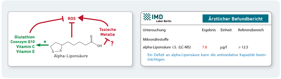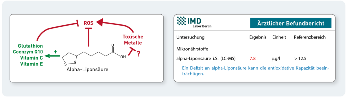Alpha-Liponsäure wirkt in wässriger wie fettlöslicher Umgebung, regeneriert Glutathion, Vitamin C und E und schützt Mitochondrien vor oxidativem Stress. Niedrige Serumspiegel weisen auf ein vermindertes antioxidatives Potential hin. Die Bestimmung ist vor allem bei Mangel an intrazellulärem Glutathion, oxidativem Stress sowie bei diabetischer Polyneuropathie sinnvoll. Eine effiziente Metallbindung durch alpha-Liponsäure ist zwar im Menschen nicht erwiesen – unstrittig ist jedoch ihre Fähigkeit, bei chronischer Metallbelastung, metallinduzierte oxidative Schädigungen wirksam abzufangen.