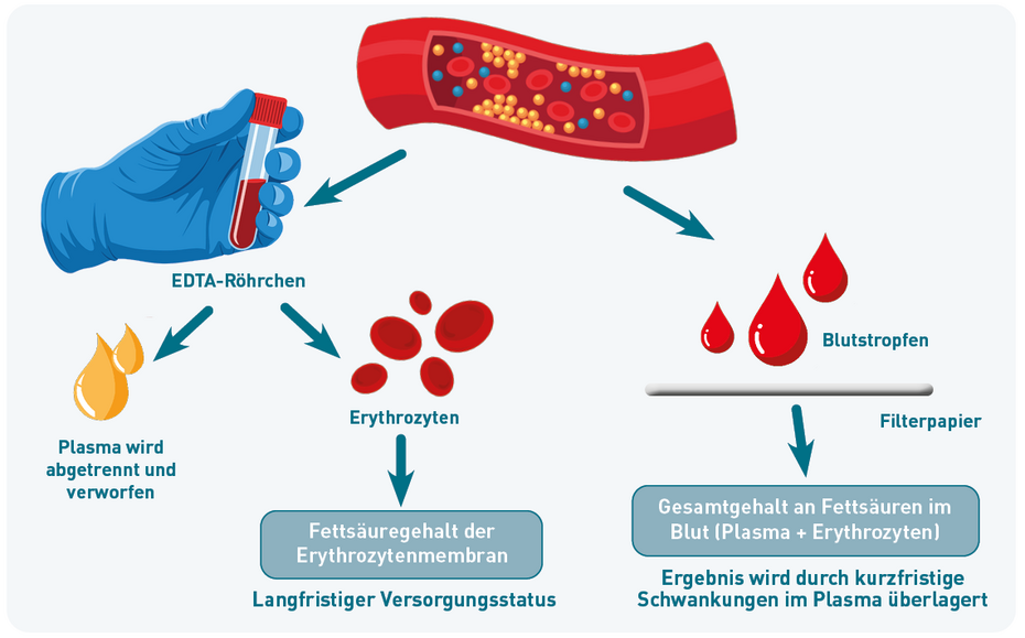 - Auf dem Bloodspot-Papier hingegen trocknen nicht nur die Erythrozyten, sondern auch alle Plasmabestandteile ein. Die Trockenblut-Messung erfasst daher nicht nur die Fettsäuren aus den Membranen, sondern auch die im Plasma zirkulierenden, kurzfristig stark schwankenden Anteile.