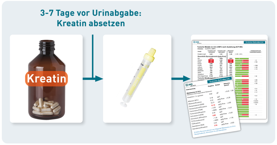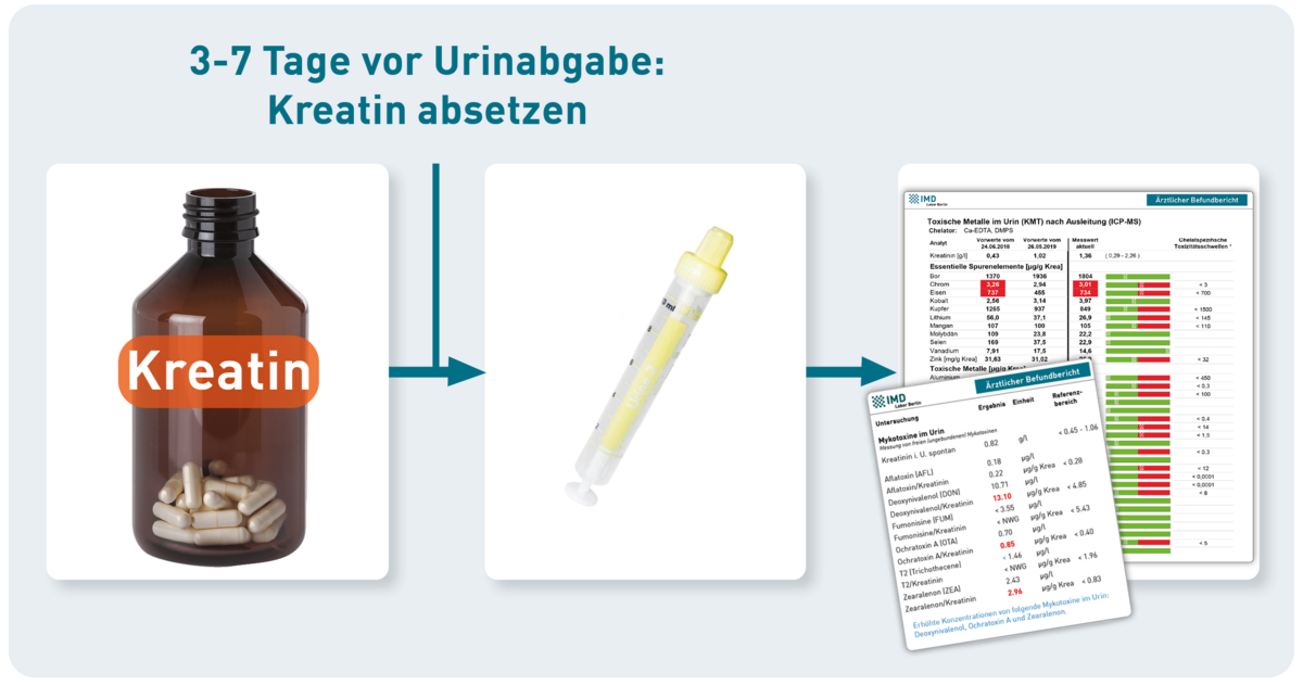 - Vor einer Urinuntersuchung sollte Kreatin als Nahrungsergänzungsmittel 3 Tage lang nicht eingenommen werden - bei langfristiger Supplementierung (z. B. Bodybuilding) ist ein längeres Absetzen sinnvoll (bis zu 7 Tage).