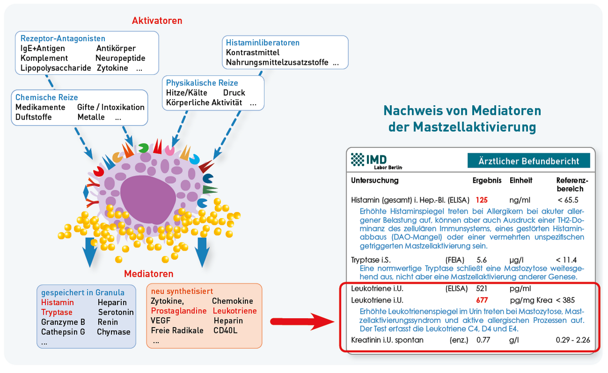 Leukotriene sind Entzündungsbotenstoffe, die nach Aktivierung von Mastzellen neu gebildet werden. Im Urin gemessen, gelten sie als empfindlicher Marker einer Mastzellaktivierung, da ihre Konzentration im Vergleich zu anderen Mediatoren, wie z.B. Prostaglandin-Metaboliten, über einen längeren Zeitraum stabil bleibt. Erhöhte Werte finden sich bei Mastozytose, Mastzellaktivierungssyndrom (MCAS) und aktiven allergischen Reaktionen. Die Bestimmung der Leukotriene C₄, D₄ und E₄ erfolgt im Spontanurin oder Sammelharn per ELISA. Auch bei normaler Tryptase kann ein erhöhter Leukotrienwert auf eine Mastzellaktivierung hinweisen und unterstützt so die differenzierte Diagnostik mastzellassoziierter Erkrankungen.