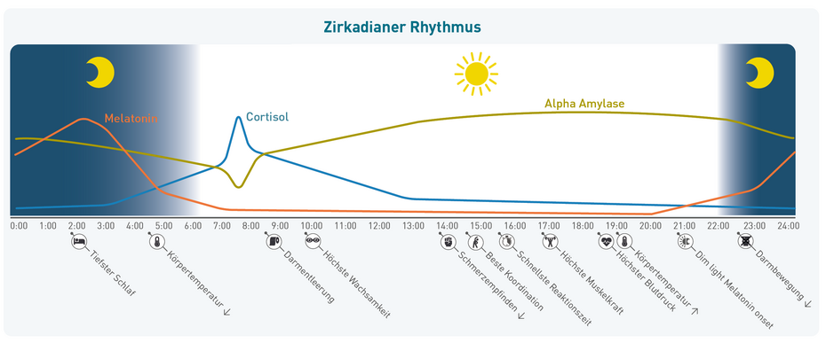 Abb.: Der zirkadiane Rhythmus wird durch die Master-Uhr im Hypothalamus gesteuert und reguliert zentrale Körperfunktionen wie Hormon-Haushalt, Schlaf-Wach-Rhythmus, Stoffwechsel und Körpertemperatur. Dadurch beeinflusst er maßgeblich die tägliche Aktivität, Leistungsfähigkeit und physiologischen Prozesse im 24-Stunden-Takt.