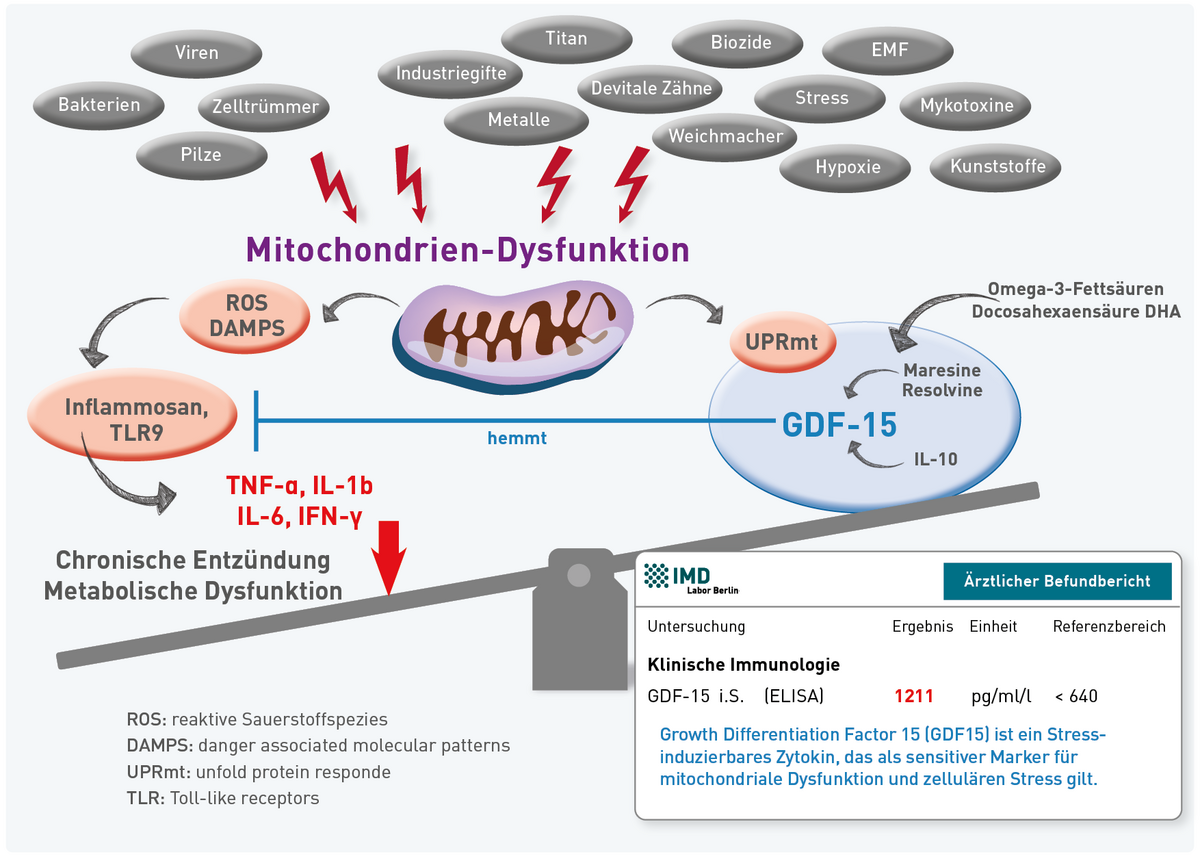 Growth Differentiation Factor 15 (GDF15) wird von vielen Zelltypen, u.a. Muskelzellen, Leberzellen, Neuronen, Fibroblasten aber auch Adipozyten und Makrophagen gebildet und ins Serum abgegeben, wenn diese Zellen unter Mitochondrienstress leiden. Daher gilt GDF15 als Mitochondriopathie-Marker, der im Vergleich zu allen ATP-Messverfahren den Vorteil hat, dass er nicht nur die verminderte Mitochondrienfunktion von im Blut zirkulierenden Leukozyten widerspiegelt, sondern auch die Situation in Geweben und Organen anzeigt. GDF15 ist ein Produkt der mitochondrialen Stressantwort (unfolded protein response – UPRmt), weshalb vor allem mitochondrienreiche Zellen zum Anstieg der GDF15-Blutspiegel beitragen. Die Bedeutung von GDF15 im Mitochondrienstoffwechsel hängt eng mit seiner Relevanz für Alterungsprozesse zusammen (siehe „Für Sie Gelesen“).