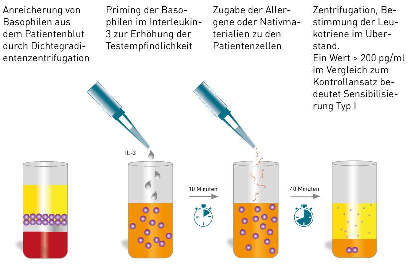 Bei diesem zellulären Funktionstest werden die basophilen Granulozyten aus dem Patientenblut angereichert und die Freisetzung der vasoaktiven Mediatoren (d.h. von Leukotrienen) in Folge einer Stimulation mit Allergenextrakten oder auch nativen (mit eingesendeten) Allergenen bestimmt. Dieser Test besitzt eine sehr hohe Sensitivität und hohe klinische Relevanz (»in vitro-Provokationstest«).