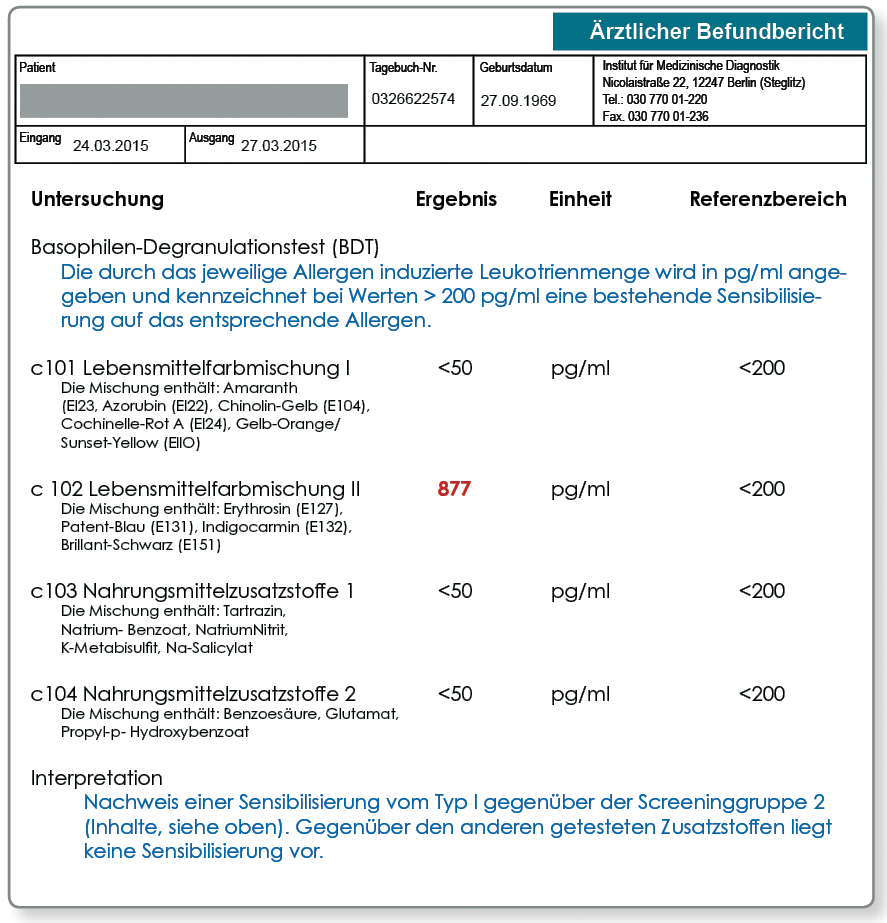 Bei diesem Test werden Basophile Granulozyten aus dem Patientenblut angereichert und im Labor mit den Nahrungsmittelzusatzstoffen stimuliert. Anschließend werden im Stimulationsüberstand die Leukotriene LTC4, LTD4 und LTE4 gemessen. Ein im Vergleich zu einem unstimuliertem Kontrollansatz erhöhte Freisetzung spricht für eine Sensibilisierung des Patienten. Gemäß den aktuellen allergologischen Leitlinien sollte die Diagnose durch einen Provokationstest gesichert werden.